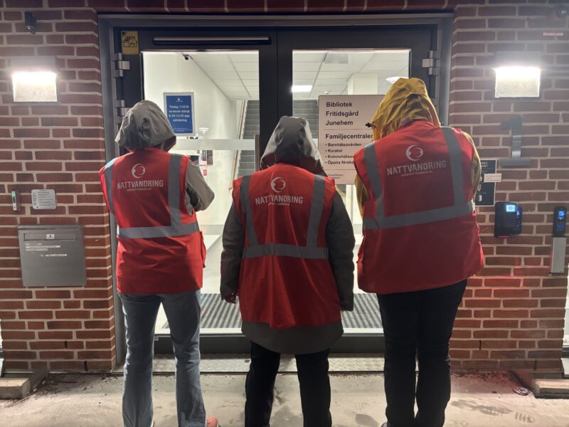 Denna lördag samlas tre nattvandrare för att gå tillsammans. På plats finns Maria Villyson, gruppsamordnare, och nattvandrarna Malin Kling och Linda Krantz. De är alla mammor och har barn som är i samma ålder.