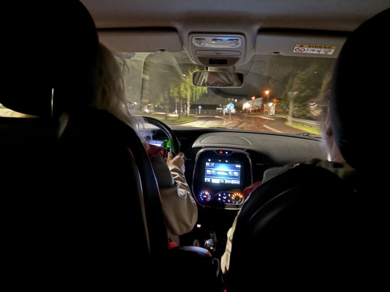 Det har blivit dags att köra en sväng till i området, och nattvandrarna intar sina platser i bilen. På vägen passerar de både skog och villor. Ibland går en äldre person på gatan med telefonen i örat, ibland står några ungdomar vid vägen och vinkar till nattvandrarna.