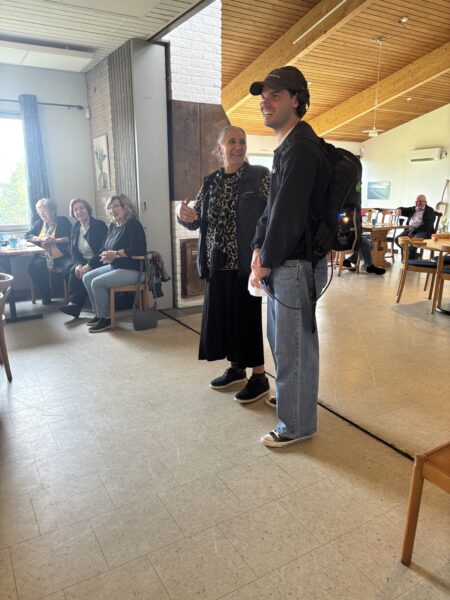 Innanför ytterdörren och bakom ryggsäcken, uppmärkt med Sveriges Radios logga, står Seyde Aslan. Hon är ledare för Friluftsfrämjandet Öxnegårdens projekt Må bra i Naturen, och ska strax intervjuas av P4 efter att Jönköpings kommun presenterats som “Årets friluftskommun 2025” för sitt ekonomiska stöd till initiativet.