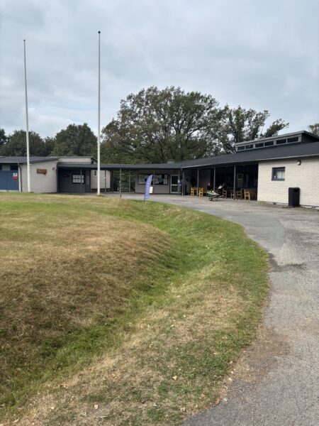 Efter en grå förmiddag strålar solen sakta men säkert fram. Uteserveringen står nu nästintill tom, och i närheten av Friluftsfrämjandet Öxnegårdens lokaler har en hund och ägare dykt upp i den hundrastgård som tidigare stått öde.